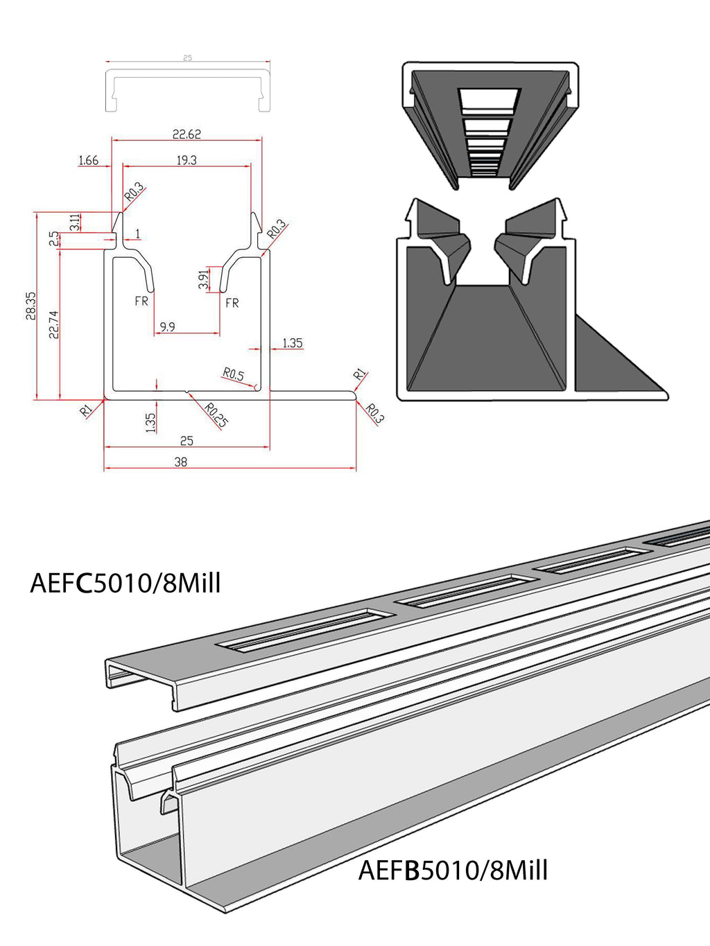 Extruded aluminium F-Channel Base + Cover to suit 50x10 2 separate pieces Mill finish (raw) 8 metre length 4.16kg per length (together) Made in Vietnam